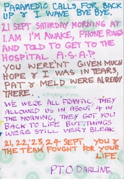 Out of the blue, Chrissie developed Neisseria Meningitis, a very rare strain of the disease, followed by septicaemia. It started deceptively as a general unwell feeling followed by a very sore throat 4 days later, then gradually worsened and three days later on Friday 20th September she was rushed into Intensive Care in Gloucester. Paramedics saved her life on the way but she went into a coma, hovering for several days between life and death. Ron was called into the hospital at 1 am the next day and was warned that she might not make it. This is part of a card written by Ron during the darkest days.